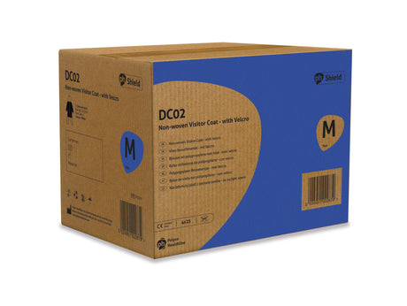 Pachet / Set vizitator: o capelină bufantă netesută, un halat alb pentru vizitatori din polietilenă, doi botoșei din CPE albăștri și o mască de față din hârtie albă