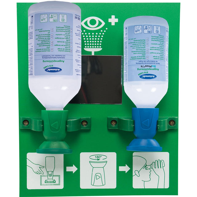 Stația de spălare a ochilor Actiomedic Double II oferă o soluție rapidă și eficientă pentru protecția ochilor în caz de expunere la substanțe iritante sau periculoase. Concepută pentru montare pe perete, stația combină două soluții sterile esențiale pentru clătirea ochilor: o sticlă de 500 ml cu soluție de clorură de sodiu 0,9% și o sticlă de 250 ml cu soluție tampon fosfat BioPhos®74 4.9%.