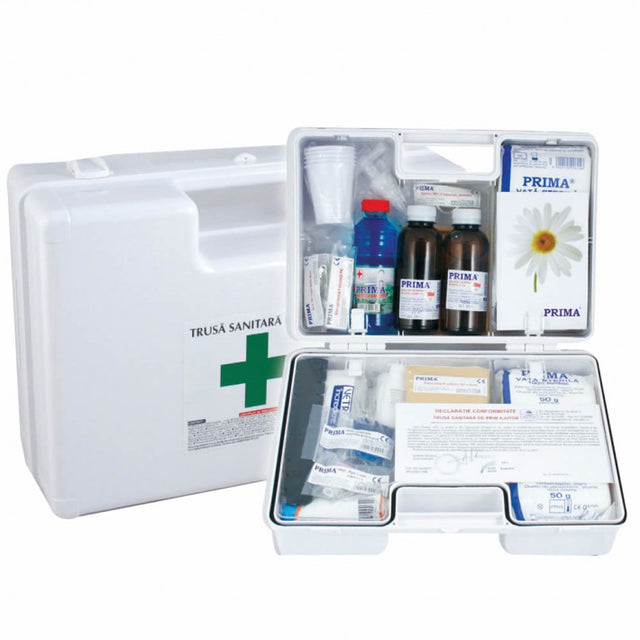- Kit complet pentru prim ajutor: materiale sterile, dezinfectanți, instrumentar medical, accesorii