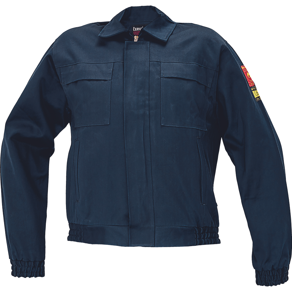 Jacheta COEN FR+AS, albastru închis, este o jachetă de lucru ignifugă și antistatică, realizată din 100% bumbac FR (material rezistent la foc) cu greutatea de 350 g/m². Aceasta este concepută pentru protecție împotriva contactului scurt cu căldura și flacăra, precum și pentru prevenirea acumulării de electricitate statică. Jacheta are două buzunare exterioare aplicate pe piept cu clapete cu arici, două buzunare interioare acoperite, mâneci cu manșete elastice și tiv elastic pe părțile laterale pentru confort și ajustare. Închidere se face cu clapă și Velcro.