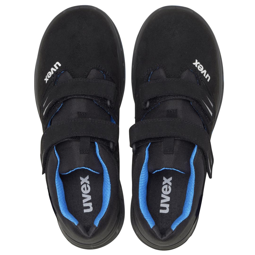 Uvex 2 trend S1 P sandale de protecție, lățime 11 sunt sandale sportive și confortabile, destinate utilizării în medii cu risc mediu (standard EN ISO 20345:2022 + A1:2024, categorie S1 P). Sunt fabricate din materiale sintetice, fiind potrivite și pentru persoanele alergice la crom, și au închidere dublă reglabilă cu scai. Sandalele dispun de bombeu și lamelă de protecție din oțel, talpă din poliuretan dublu densitate cu aderență foarte bună (SR), și tehnologie de amortizare excelentă, oferind un confort ridicat. Integrează protecție ESD cu rezistență la descărcări electrostatice sub 100 megaohmi și dispun de căptușeală cu elemente reflectorizante pentru vizibilitate sporită. Talpa asigură stabilitate suplimentară prin capac anti-răsucire a călcâiului pentru prevenirea accidentărilor la gleznă.