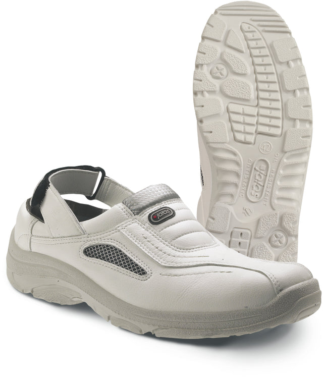 Sandalele JALAS® CLEAN 5012 MENU WHITE sunt concepute pentru utilizare în medii profesionale interioare, inclusiv în zone cu risc de alunecare, cum sunt curățarea, bucătăriile, domeniul medical, hotelurile, restaurantele și magazinele. Aceste sandale oferă o potrivire normală și un grad ridicat de confort pentru purtare îndelungată. Talpa exterioară este rezistentă la ulei, prevenind alunecarea în condiții umede sau uleioase. Sunt prevăzute cu sistemul patentat de absorbție a șocurilor Ergothan, care reduce oboseala la nivelul picioarelor prin amortizare eficientă a impactului. Sandalele sunt certificate conform standardului EN ISO 20347:2022, categoria O1, oferind protecție antistatică (ESD) utilă în medii sensibile la electricitate statică. Partea superioară este realizată din microfibră durabilă, fiind ușoară și respirabilă. Fixarea se face cu bandă de arici pentru o reglare rapidă și comodă.