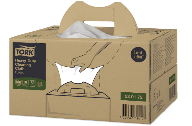 Sarcinile grele necesită o cârpă de curățare puternică și absorbantă. Laveta noastră de curățare Tork Heavy-Duty, cu 1 strat, se potrivește și poate fi folosită cu majoritatea solvenților pentru a combate rapid scurgerile de ulei, grăsime și lichide. Optimizați consumul și minimizați risipa de cârpe de curățat cu funcția de distribuire individuală. Deschiderea mare a Handy Box înseamnă că cârpele sunt ușor de accesat. Îmbunătățiți sustenabilitatea operațiunii dvs. - acest ambalaj al produsului este realizat din fibre 100% reciclate.