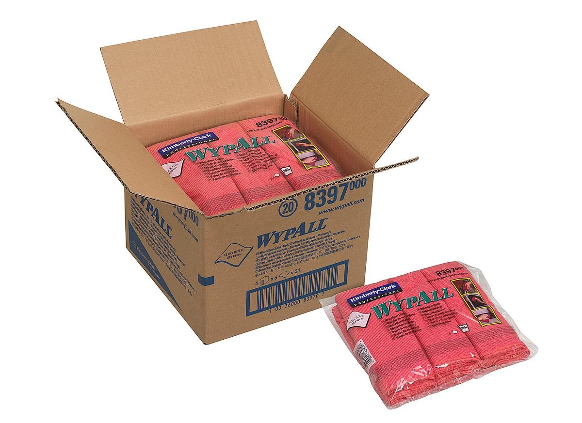 Lavetele WypAll Microfibre Cloths 8397 sunt lavete reutilizabile, roșii, de 40 x 40 cm, proiectate pentru curățarea eficientă și economică. Acestea absorb până la 8 ori greutatea lor în lichide și pot fi spălate până la 300 de ori, oferind astfel o soluție durabilă pentru profesioniștii din domeniul curățeniei. Tehnologia microfibră ridică și reține murdăria și umezeala, lăsând suprafețele curate, uscate și lustruite, reducând timpul necesar curățării comparativ cu lavetele din bumbac.