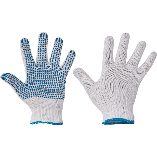 Mănușile PLOVER sunt tricotate din poliester și bumbac alb, cu manșetă elastică tricotată. Zona palmei și degetelor este acoperită cu picouri punctiforme albastre din PVC, oferind aderență sporită. Sunt mănuși stratificate fără cusături, ideale pentru lucrări ce necesită dexteritate și protecție ușoară. Conform standardului EN ISO 21420 privind cerințele generale pentru mănuși.