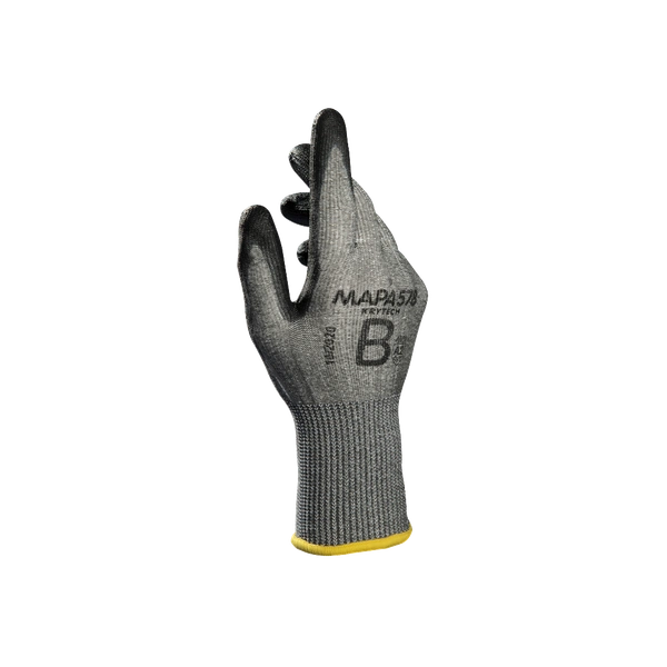 Descoperă mănușile KryTech 578 de la Mapa-Pro, ideale pentru protecție la tăiere în medii murdare, oferind confort maxim și dexteritate sporită. Aceste mănuși fără cusături sunt realizate cu tehnici speciale de împletire a firelor și au un înveliș din poliuretan ce permite pielii să respire optim, menținând mâna uscată și confortabilă în timpul lucrului. Culoarea închisă a mănușii limitează vizibilitatea murdăriei, susținând utilizarea mai îndelungată în medii de lucru solicitante. Mănușile KryTech 578 sunt fabricate fără silicon pentru a evita urmele pe suprafețe sensibile precum metalul sau sticla înainte de vopsire. Se pot spăla de 3 ori la 40°C fără a pierde proprietățile și oferă un nivel de protecție la tăiere categorie 2, conform standardului EN 388, cu un scor 4X42B și rezistență la tăiere ISO 13997 de 5N (510g).
