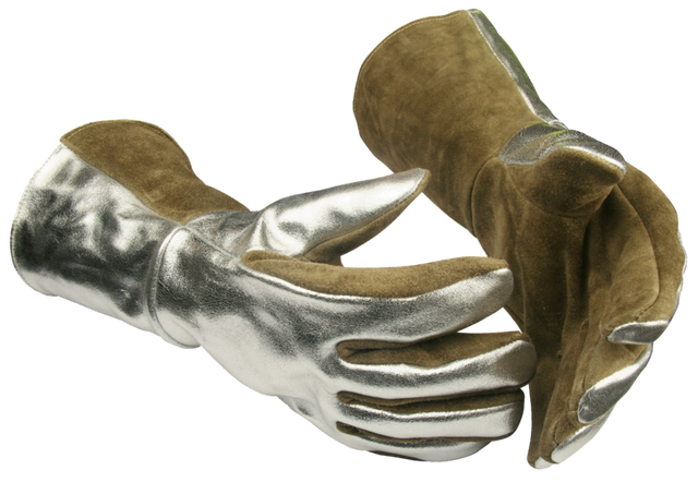 Mănușa Guide 350A oferă protecție termică eficientă pentru lucrul în medii cu temperaturi ridicate, inclusiv la turnare. Partea exterioară este aluminizată, oferind protecție și împotriva căldurii radiante, iar cusăturile sunt realizate cu fir kevlar termorezistent pentru durabilitate sporită. Materialul principal este pielea Spalt bovină, dublu căptușită cu poliester și bumbac pentru confort și izolație termică. Mănușa are formă precurbată și bandă de siguranță la încheietură pentru potrivire și protecție suplimentară. Este conformă cu standardele EN 388:2016 (3234X) și EN 407:2004 (41334X), potrivită pentru activități industriale care necesită protecție la temperaturi de contact de până la 100°C.