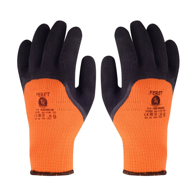 Mănușile de protectie TK FERET culoare portocalie, sunt mănuși de protecție căptușite, ideale pentru lucrul în medii reci. Confecționate dintr-o țesătură rezistentă și fără cusături, asigură confort și durabilitate, iar stratul de spumă de latex oferă o prindere excelentă și flexibilitate. Mănușile respectă standardele europene de siguranță EN ISO 21420, EN 388, EN 407 și EN 511, fiind recomandate pentru protecția mâinilor în condiții de temperaturi scăzute și la manipularea obiectelor în medii dificile.