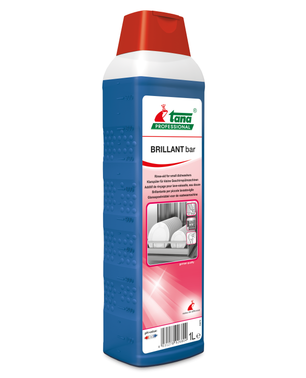 BRILLANT bar este un agent de clătire concentrat pentru mașini mici de spălat vase. Produsul este eficient în evitarea formării spumei deranjante și previne depunerile de calcar pe vase și tacâmuri, neutralizând reziduurile alcaline din băile de curățare. BRILLANT bar contribuie la obținerea unui luciu foarte ridicat și accelerează procesul de uscare a vaselor. Este potrivit pentru apă moale până la mediu dură și are un sistem ușor de dozare care ajută la economisirea costurilor. Disponibil în ambalaje de 1 litru, produsul respectă ciclurile biologice și protejează mediul pentru generațiile viitoare.