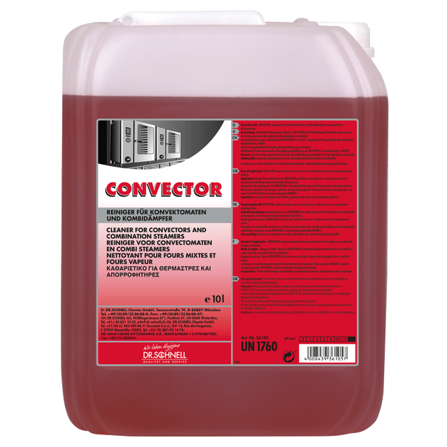 Convector este un detergent de curățare profesional special conceput pentru curățarea eficientă a cuptoarelor convectoare și a aburitoarelor combinate. Formula sa puternică îndepărtează rapid și în siguranță depunerile de grăsime, reziduuri alimentare și calcar, asigurând igiena maximă și funcționarea optimă a aparatelor din bucătărie profesională. Compatibil cu diverse materiale și ușor de clătit, Convector este ideal pentru restaurante, cantine și unități de catering ce trebuie să respecte standardele stricte de curățenie. Produsul respectă reglementările de siguranță și este eficient chiar și în condiții de muncă intense.