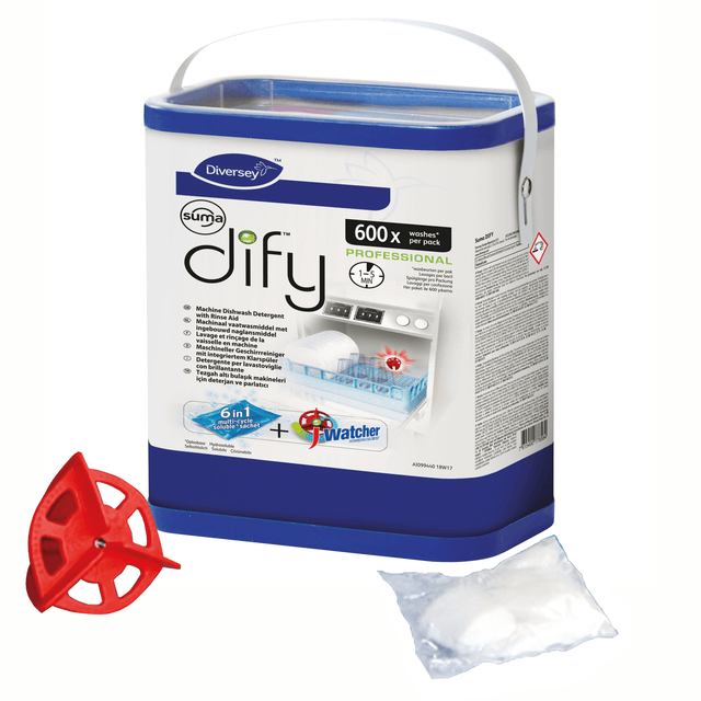 Suma Dify este o soluție special concepută pentru mașini cu cicluri multiple, încorporabile sub blat și cu încărcare frontală, care oferă performanța unui sistem profesional, fără necesitatea instalării de echipamente. Săculețul solubil conține o combinație revoluționară de produse, constând din detergent, aditiv de clătire, detartrant și înălbitor, care oferă rezultate excelente în cazul paharelor. Senzorul inteligent JWatcher vă anunță când trebuie să adăugați un nou săculeț pentru următoarele 15 sau mai multe cicluri.